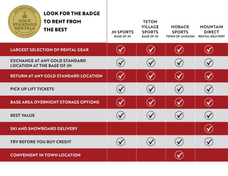 Across Jackson Hole, our rental experts share one mission: to make your days on snow effortless and fun. Teton Village Sports, JH Sports, Hoback Sports, and Mountain Direct together are united under Gold Standard Rentals, the Jackson Hole Mountain Resort-owned and operated rental network designed to give you the best and most flexible rental experience in the valley.